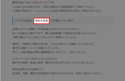 配送方法:特別大型便のお届けについて
