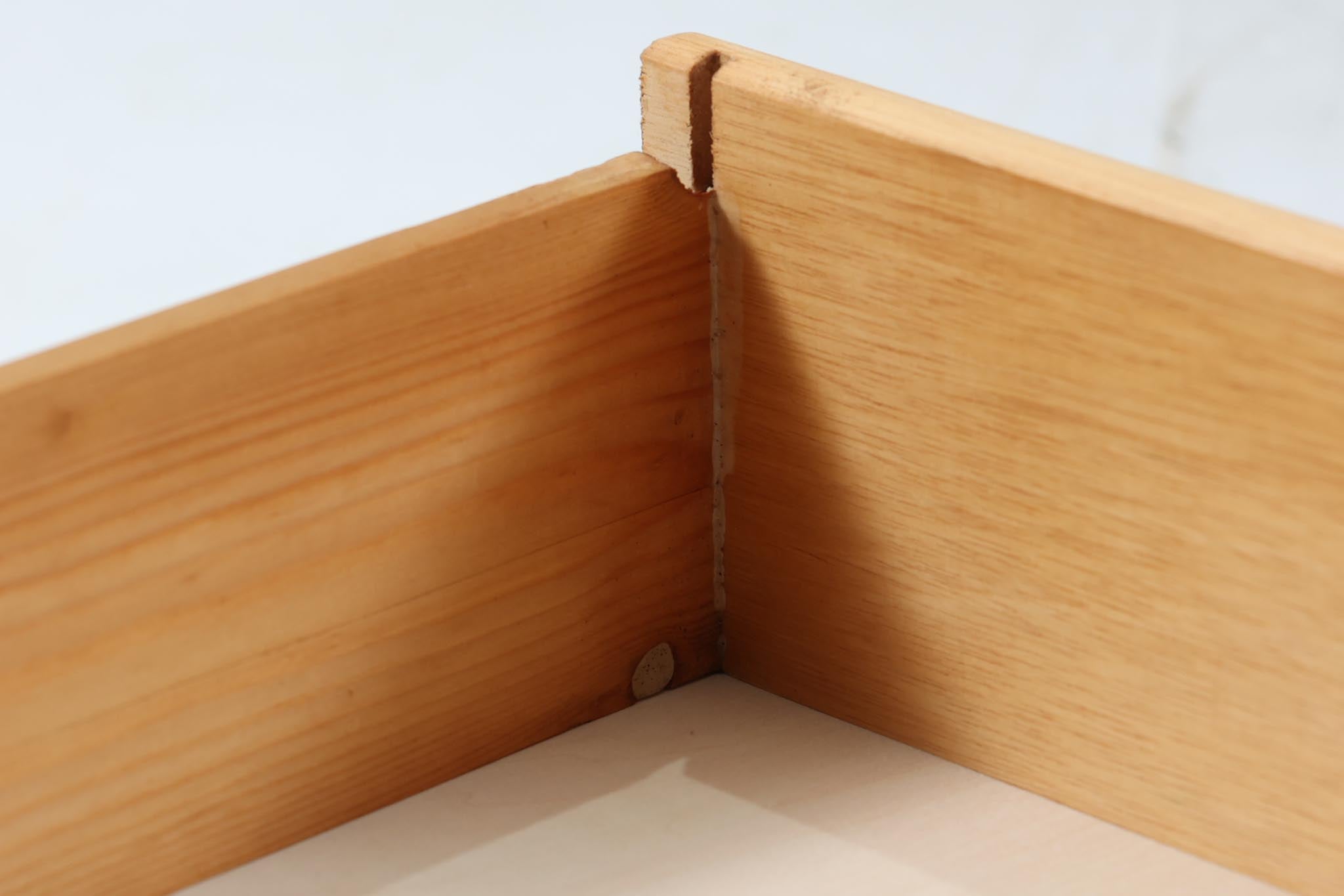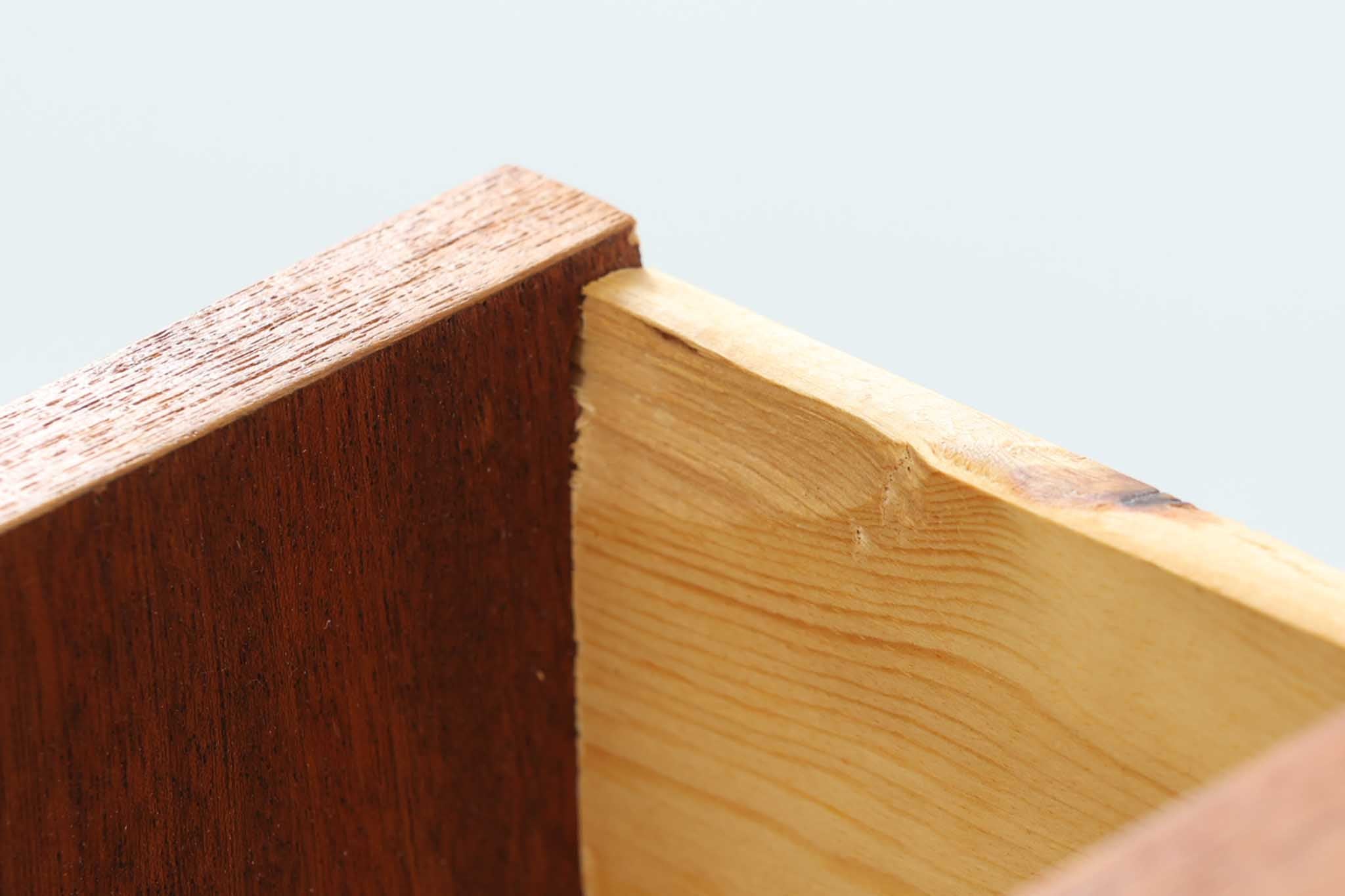 無垢材を使用した箇所には、細かいヒビや節穴が見られることがありますが、これらは自然素材特有の特徴であり、使用に問題はありません。例えば、引き出し内部の側板やダイニングテーブルのレール部分にも無垢材が使用されている場合があり、その場合には同様の症状が見られることがあります。また、ジョイント部には細かいボンド跡や、引き出し内部や本体内部に小さな欠けなどが見受けられることもありますが、いずれも使用に支障はありません。