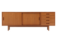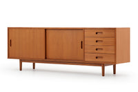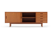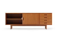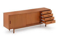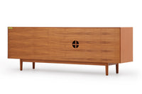 商品説明 | 北欧モダンスタイルのサイドボードです。TVボードはシンメトリーなタイプが多いですが、こちらのお品は引出しを右側に集中させたアシンメトリーなデザイン。お部屋を個性的かつおしゃれに演出します。素材は全てチーク材。突き板、無垢材を耐久性、機能性を考えて使い分けています。突き板は全て両面張り。通常安価なベニヤ板などが用いられる背面にも、チーク天然木の突き板を贅沢に使用しています。天然木は美しい暖かな風合いの木目が心地よさを演出します。 収納部も多くサイドボードとして、またAVボードとしても使い勝手が大変良いお品です。 |