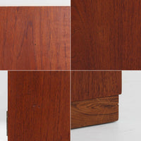 商品説明 | Hans J. Wegnerがデザインし、Ry Mobler社より製造されたこちらのディスプレイシェルフは、チーク材の上質な素材使いと真鍮パーツのディテールが際立つ北欧ビンテージ家具です。シンプルな直線的フォルムの中に、扉付き収納、ドロップダウン式のビューロスペース、小引き出しや仕切り棚など機能的な構造が備わっており、書斎でのデスク兼収納やリビングの飾り棚として多用途に活躍します。年月を経て深みを増した木肌が空間に落ち着いた存在感を与える逸品です。 |